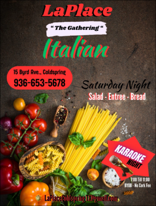 15 - 5:00 - 8:00 pm - Italian Night with Karaoke at LaPlace the Gathering Restaurant.