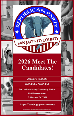 13 - 6:00 pm - Meet The Candidates, San Jacinto County Republican Club at San Jacinto County Shelter.
