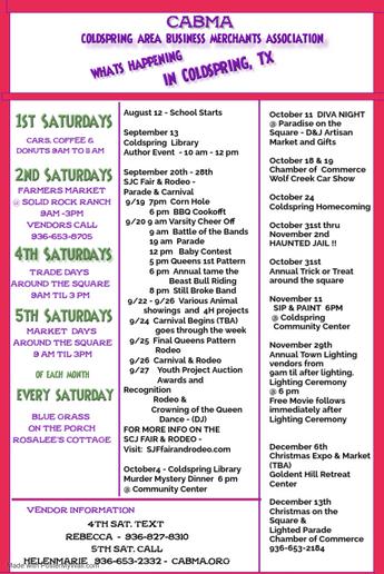 1st & 3rd Saturday - 9 am - 2 pm Coldspring Farmer's Market Plus, LLC, On the Courthouse Square, Coldspring - "Homemade - Handmade - Homegrown!"