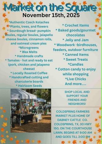 15 - 9 am - 2 pm - Market on The Square, Coldspring TX