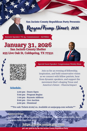 31 - Doors open 5 pm -Reagan Trump Dinner - San Jacinto County Republican Club at The Shelter in Coldspring. Tickets available in advance at SJC Republican HQ.