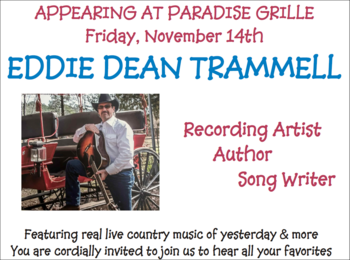 14 - 5:30 - 8:30 pm - Eddie Dean Trammell, Entertainment to enjoy with dinner at Paradise Grille, Coldspring
