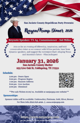31 -Reagan Trump Dinner - San Jacinto County Republican Club at The Shelter in Coldspring. Tickets available in advance at SJC Republican HQ.